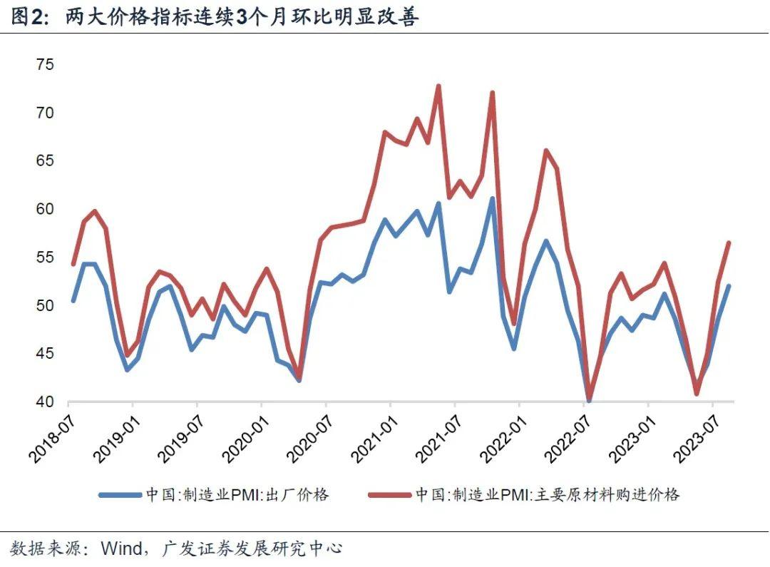 值得注意的是,PMI两个价格指标上行特别明显。其中原材料价格环比上行4.1个点,出厂价格指数环比上行3.4个点,均创2022年5月以来的新高。其中出厂价格还是今年3月以来首次上行至荣枯线以上。价格环比回升将进一步夯实PPI同比回升的趋势。