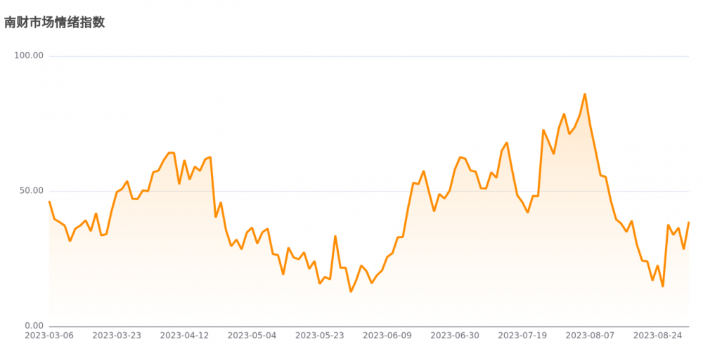 今日南财市场情绪指数为38.8,较前一交易日28.5大幅上涨,市场投资热度明显提升。