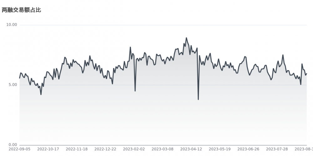 今日该指标值为5.98%,目前该指标处于近一年较低区间,说明投资者认为A股市场趋于触底反弹。反映场内投资者借钱炒股的杠杆水平,该指标越高说明杠杆水平越高,即投资者认为当前市场较强,反之则说明投资者认为市场相对较弱,因而与上证指数存在较强的正相关性。