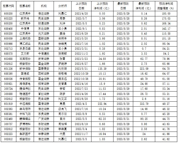 获上调幅度最大的是江苏吴中(600200)。信达证券分析师刘嘉仁在8月29日发表的题为《江苏吴中:医药业务持续恢复中,期待医美产品获批贡献业绩增量》半年报点评报告指出,2023H1 医药产品销售势头恢复良好带动营收增长,预计2023年公司实现归母净利润0.14亿元,这较其在4月28日的发表的研报中预计的0.05亿元大幅上调了180%。