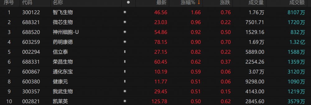 涨幅方面,智飞生物涨近2%,微芯生物、神州细胞-U、药明康德、信立泰等涨近1%。
