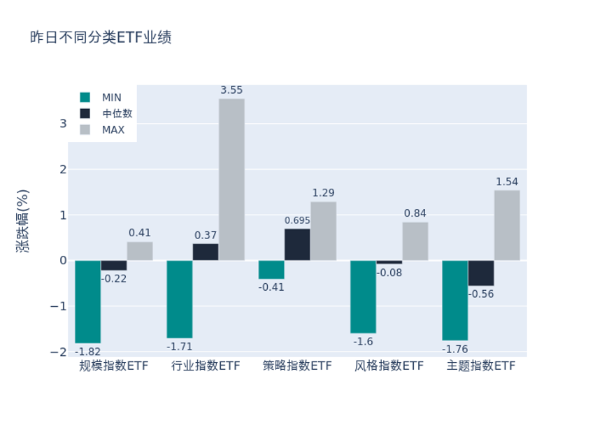 昨日股票型ETF收益率中位数为-0.31%。其中按照不同分类,规模指数中博时上证超大盘ETF收益率最高,为0.41%;行业指数中国泰中证煤炭ETF收益率最高,为3.55%;策略指数中华泰柏瑞上证红利ETF收益率最高,为1.29%;风格指数中上证180价值ETF收益率最高,为0.84%;主题指数中博时上证自然资源ETF收益率最高,为1.54%。