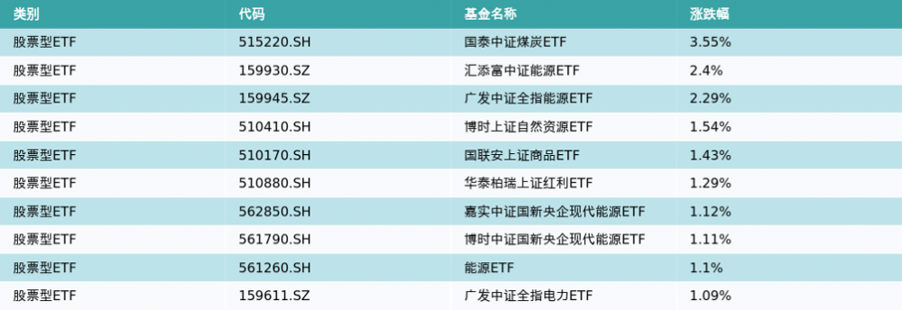 昨日股票型ETF涨幅最高的3支ETF及其收益率分别为:国泰中证煤炭ETF(3.55%)、汇添富中证能源ETF(2.4%)、广发中证全指能源ETF(2.29%)。涨幅前10详情见下表: