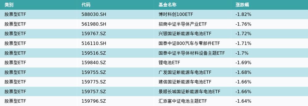 昨日股票型ETF跌幅最大的3支ETF及其收益率分别为:博时科创100ETF(-1.82%)、招商中证半导体产业ETF(-1.76%)、兴银国证新能源车电池ETF(-1.72%)。跌幅前10详情见下表: