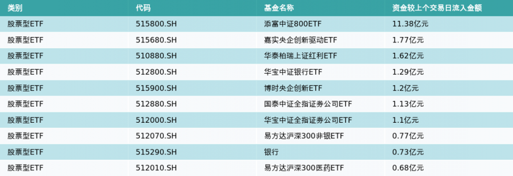 昨日股票型ETF资金流入最多的3支ETF及其流入金额分别为:添富中证800ETF(流入11.38亿元)、嘉实央企创新驱动ETF(流入1.77亿元)、华泰柏瑞上证红利ETF(流入1.62亿元)。资金流入前10详情见下表: