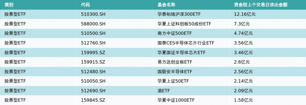 昨日股票型ETF资金流出最多的3支ETF及其流入金额分别为:华泰柏瑞沪深300ETF(流出12.16亿元)、华夏上证科创板50成份ETF(流出7.3亿元)、南方中证500ETF(流出4.74亿元)。资金流出前10详情见下表: