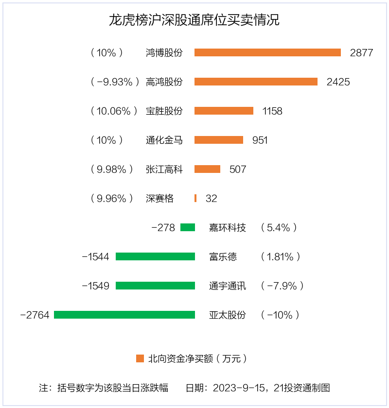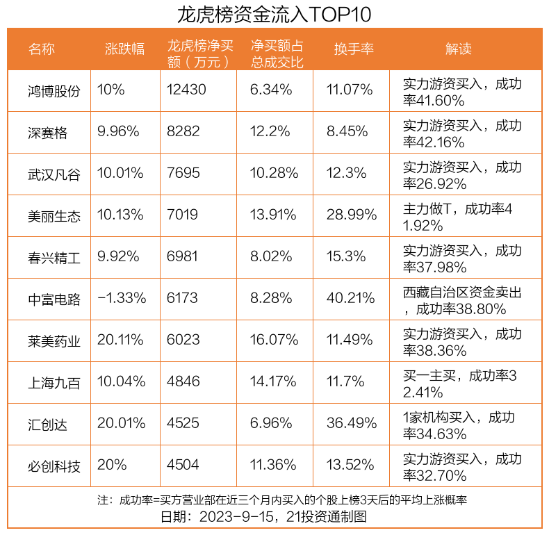9月15日,上证指数下跌0.28%,深证成指下跌0.52%,创业板指下跌0.45%。盘后龙虎榜数据显示,共有35只个股因当日异动登上龙虎榜,资金净流入最多的是鸿博股份(002229.SZ),达1.24亿元。