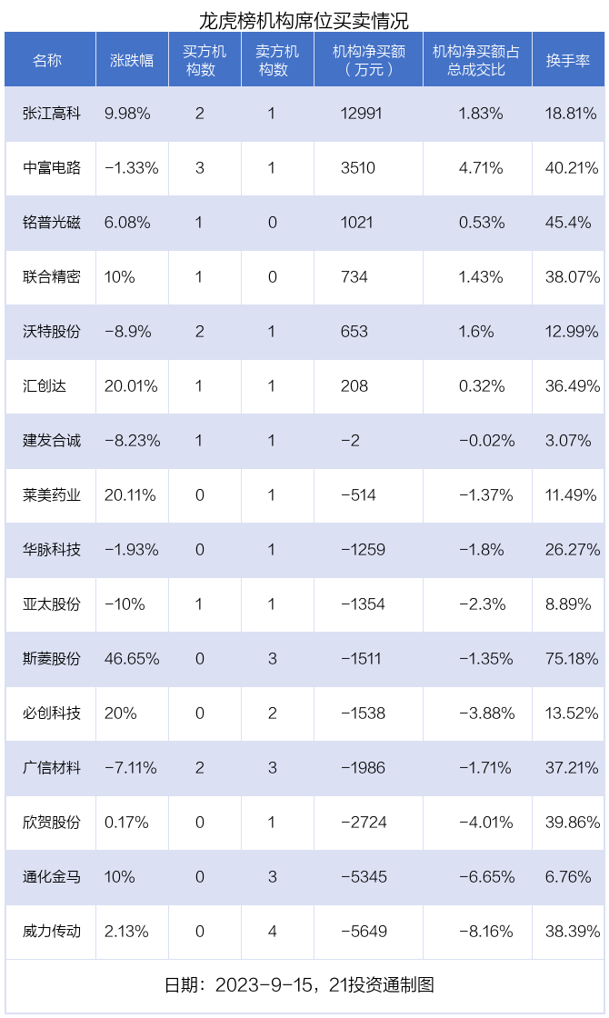 9月15日,16只个股龙虎榜出现了机构的身影,机构合计净卖出2764.67万元。具体来看,机构净买入6股,净卖出10股。