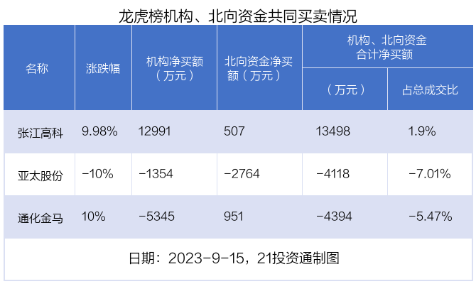 值得注意的是,机构和北向资金共同净买入了张江高科等1股;共同净卖出了亚太股份;在通化金马上出现分歧,机构净卖出通化金马5344.85万元,北向资金净买入950.73万元。