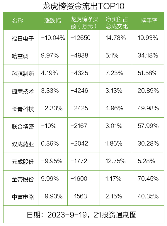 而龙虎榜中资金净流出最多的是福日电子(600203.SH),被净卖出为1.27亿元,占总成交金额的14.78%。福日电子收盘下跌10.04%,换手率为19.93%。