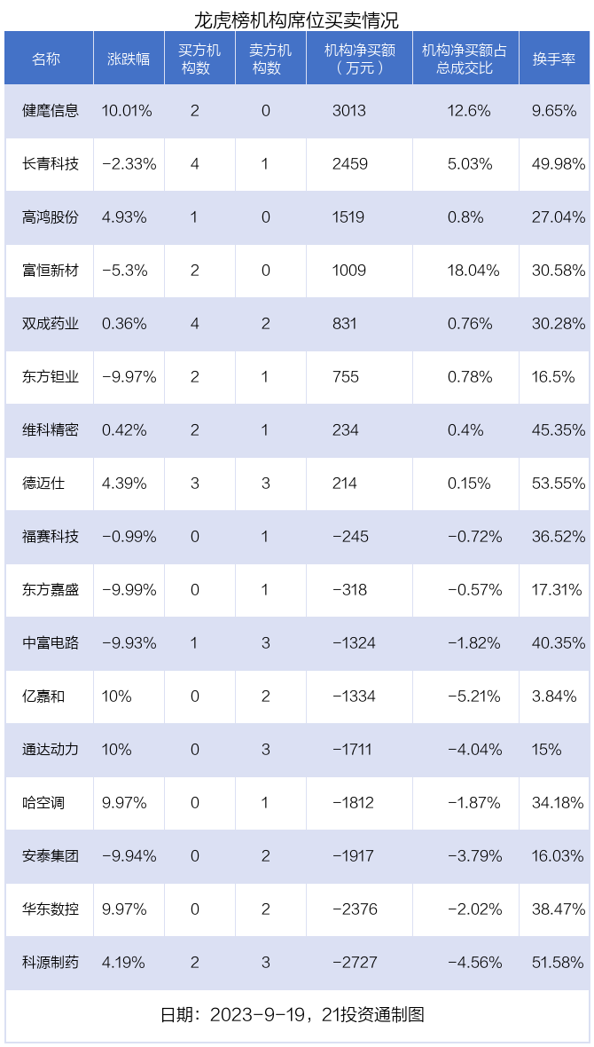 其中,机构净买入金额最多的是健麾信息(605186.SH),当日收盘上涨10.01%,换手率为9.65%。