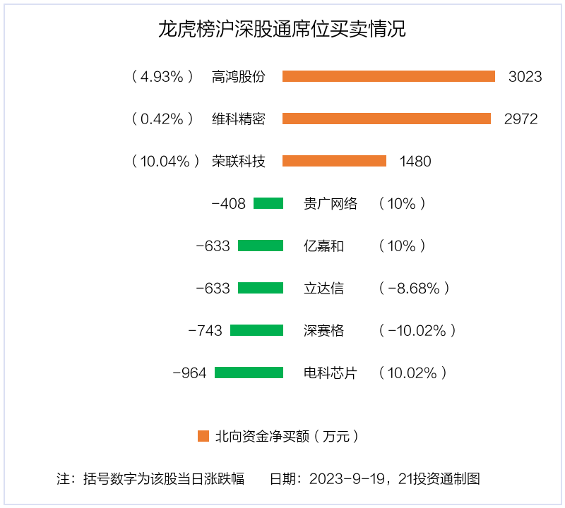 9月19日,北向资金参与龙虎榜中的个股共有8只,合计净买入4094.97万元。其中沪股通净卖出4 股,合计净卖出2637.13万元;深股通净买入3股,净卖出1股,合计净买入6732.11万元。