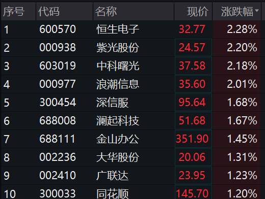 其中,恒生电子、紫光股份、中科曙光、浪潮信息涨超2%,深信服、澜起科技、金山办公、大华股份、广联达、同花顺等股跟涨。