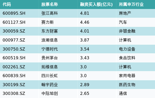 9月21日,两市共有3286只个股有融资资金买入,其中张江高科、赛力斯、东方财富排名前三,买入金额分别4.81亿元、4.46亿元、4.01亿元。融资买入额前10个股详情见下表:
