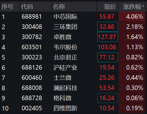 其中,芯片股涨幅居前,中芯国际涨超4%,三环集团涨超2%,卓胜微、韦尔股份涨超1%,北京君正、沪硅产业、士兰微等股跟涨。