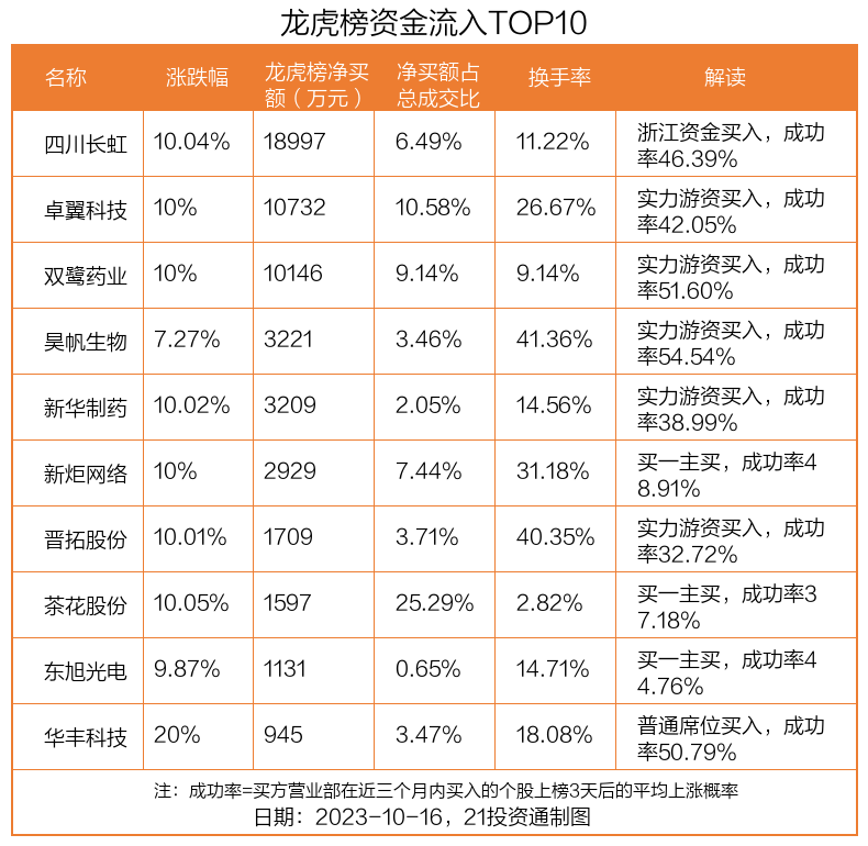 10月16日,上证指数下跌0.46%,深证成指下跌1.42%,创业板指下跌2%。盘后龙虎榜数据显示,共有43只个股因当日异动登上龙虎榜,资金净流入最多的是四川长虹(600839.SH),达1.9亿元。
