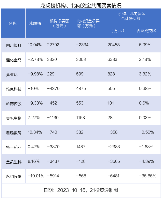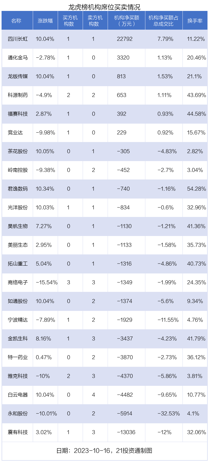 其中,机构净买入金额最多的是四川长虹(600839.SH),当日收盘上涨10.04%,换手率为11.22%。
