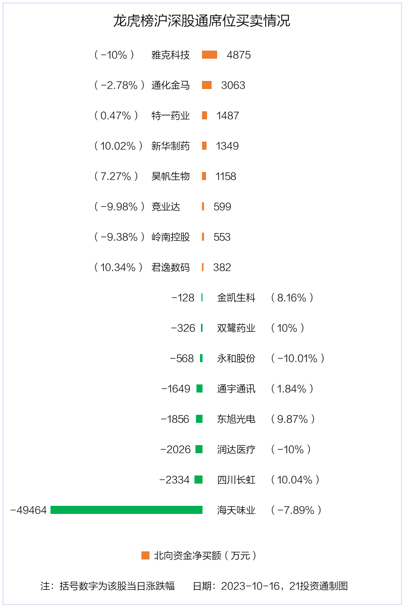 10月16日,北向资金参与龙虎榜中的个股共有16只,合计净卖出4.49亿元。其中沪股通净卖出4 股,合计净卖出5.44亿元;深股通净买入8 股,净卖出4 股,合计净买入9507.52万元。