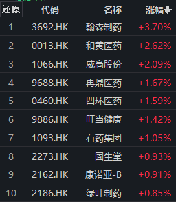港股市场上,医疗保健板块早盘冲高回落。相关指数中,中证港股通医药卫生综合指数 (930965) 盘中一度涨近2%,随后回落翻绿,成分股涨跌互现。截至发稿,翰森制药涨近4%,和黄医药、威高股份涨超2%,再鼎医药、四环医药、叮当健康、石药集团、固生堂、康诺亚-B、绿叶制药等跟涨。
