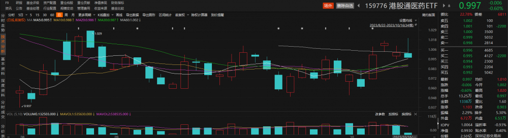 跟踪中证港股通医药卫生综合指数的港股通医药ETF(159776)早盘一度创出8月底以来新高,随后回落翻绿,但盘中交投持续活跃。截至发稿,该ETF下跌0.60%,换手率达5.30%。