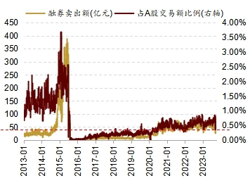 截止10月12日,A股融券余额为879亿元,占A股流通市值的比例为0.13%;融券卖出额占A股日度交易额的比例目前为0.7%左右。