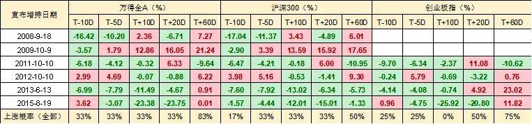 历次汇金宣布增持后3个月,市场主要指数上涨概率较高,万得全A、创业板指上涨概率分别达到86%和80%。本次汇金增持有望提振市场信心,同时为市场带来边际增量资金。