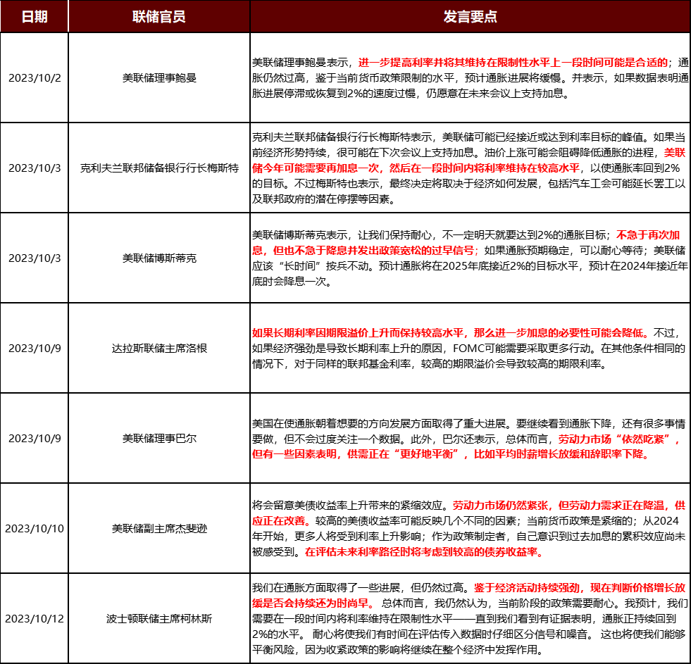 10月以来,多位联储官员就货币政策看法发声,从月初偏鹰派声音到近期多位官员释放鸽派信号。多位美联储官员表示近期美国长期国债收益率大幅上涨,可能会抵消美联储进一步提高政策利率的必要性。