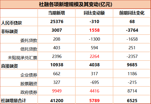 从结构上看,政府债券发行提速是社融总量超预期的主要来源;企业部门融资边际仍在放缓;居民部门融资同比环比均延续改善,结构上相对偏弱。具体来说,新增政府债券9949亿元,同比多增4416亿元;居民短贷增加3215亿元,同比多增177亿元,中长期贷款增加5470亿元,同比多增2014亿元。企业票据融资同比少增673元;企业短贷增加5686亿元,同比少增881亿元;企业中长期贷款新增12544亿元,同比少增944亿元。