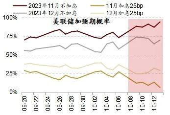 整体而言,外部环境方面,过去一周在美联储官员释放鸽派信号,以及通胀数据公布后,市场对美联储的不加息预期整体升温,目前11月的不加息预期为93.8%;12月不加息预期为70%,预计11月不加息概率较大,12月加息与否仍存悬念。