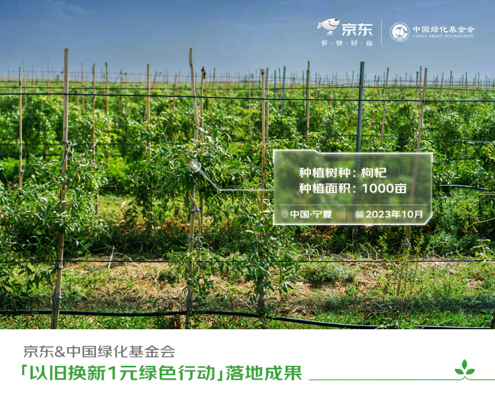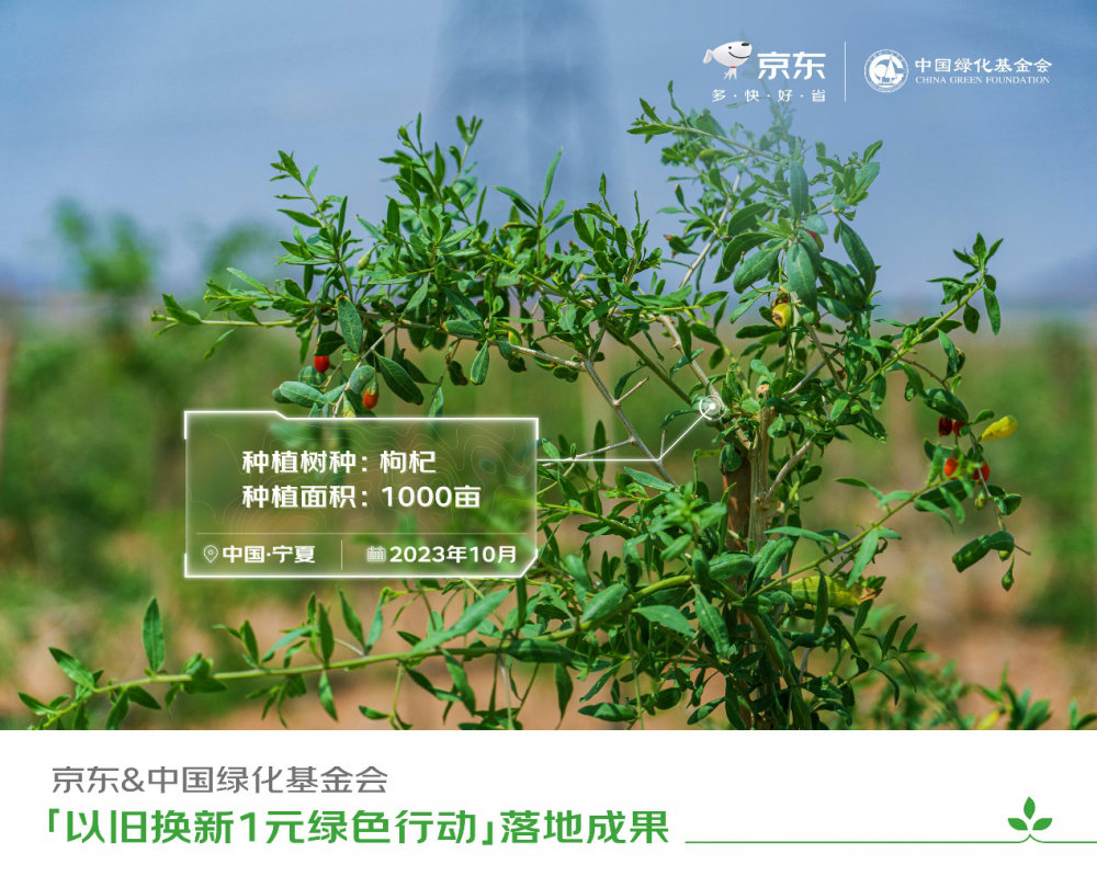 此前,京东已联合中国绿化基金会开展并落地公益种树项目,即京东以2022年8月至12月期间的手机、电脑数码、家电商品以旧换新的订单数量为基数进行公益捐赠,相关款项已用于2023年春季植树期在宁夏种植枸杞林,绿化面积超1000亩,为改善土地荒漠化、守护生态环境出力,以实际行动共建绿色未来。