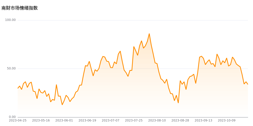 今日南财市场情绪指数为33.8,较前一交易日36.5下跌,市场投资热度降低。