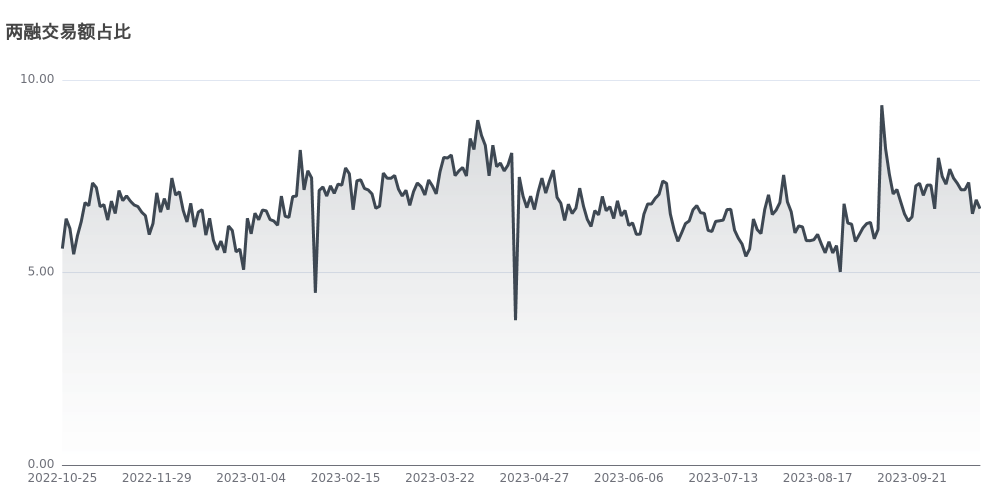 今日该指标值为6.66%,目前该指标处于近一年中立区间,说明投资者对A股持1中立情绪。反映场内投资者借钱炒股的杠杆水平,该指标越高说明杠杆水平越高,即投资者认为当前市场较强,反之则说明投资者认为市场相对较弱,因而与上证指数存在较强的正相关性。