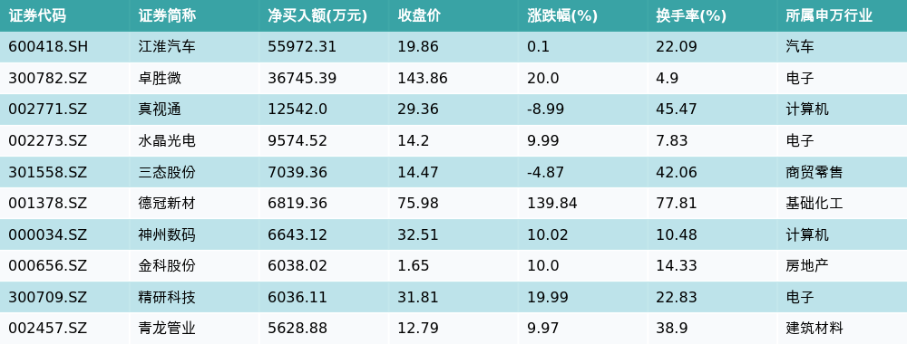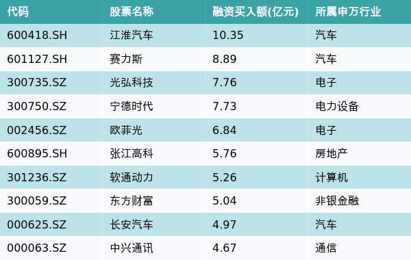10月30日,两市共有3296只个股有融资资金买入,其中江淮汽车、赛力斯、光弘科技排名前三,买入金额分别10.35亿元、8.89亿元、7.76亿元。融资买入额前10个股详情见下表:
