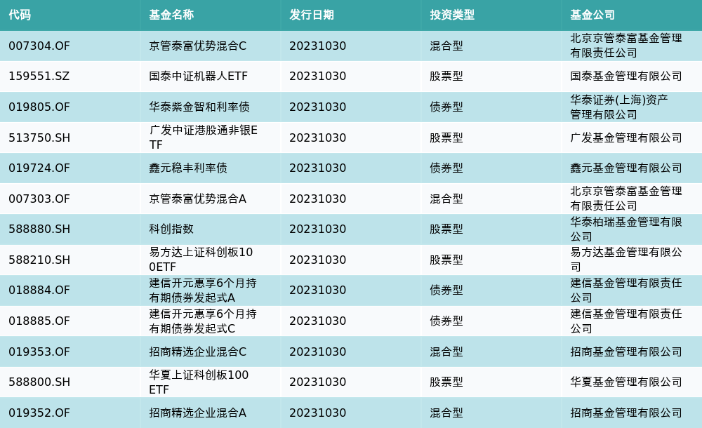 10月30日有13只新基金发行,分别为:京管泰富优势混合C、国泰中证机器人ETF、华泰紫金智和利率债、广发中证港股通非银ETF、鑫元稳丰利率债、京管泰富优势混合A、科创指数、易方达上证科创板100ETF、建信开元惠享6个月持有期债券发起式A、建信开元惠享6个月持有期债券发起式C、招商精选企业混合C、华夏上证科创板100ETF、招商精选企业混合A,详情见下表: