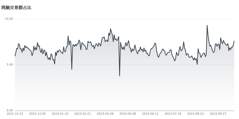 今日该指标值为7.63%,目前该指标处于近一年较高区间,认为当前A股市场相对较强。反映场内投资者借钱炒股的杠杆水平,该指标越高说明杠杆水平越高,即投资者认为当前市场较强,反之则说明投资者认为市场相对较弱,因而与上证指数存在较强的正相关性。