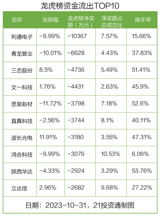 而龙虎榜中资金净流出最多的是利通电子(603629.SH),被净卖出为1.04亿元,占总成交金额的7.57%。利通电子收盘下跌9.99%,换手率为15.66%。