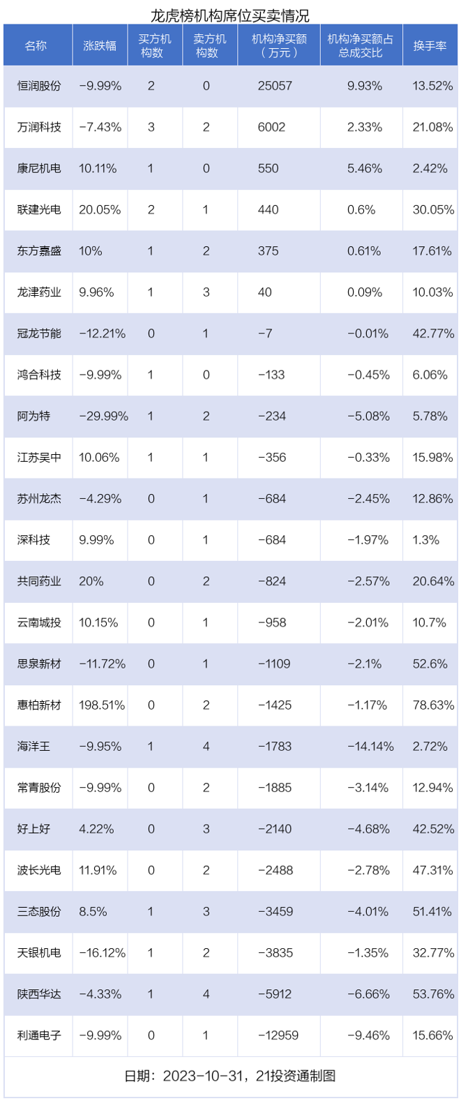 其中,机构净买入金额最多的是恒润股份(603985.SH),当日收盘下跌9.99%,换手率为13.52%。