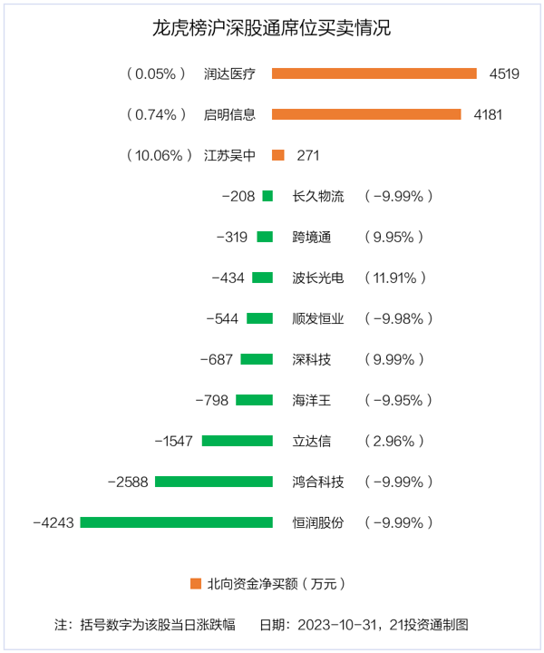 10月31日,上证指数下跌0.09%,深证成指下跌0.65%,创业板指下跌0.48%。盘后龙虎榜数据显示,共有44只个股因当日异动登上龙虎榜,资金净流入最多的是恒润股份(603985.SH),达3.68亿元。