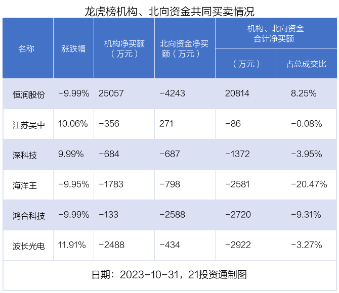 值得注意的是,机构和北向资金共同净卖出了波长光电、深科技、海洋王、鸿合科技等4股;在江苏吴中,恒润股份上出现分歧,机构净卖出江苏吴中356.39万元,北向资金净买入270.73万元;机构净买入恒润股份2.51亿元,北向资金净卖出4242.84万元。