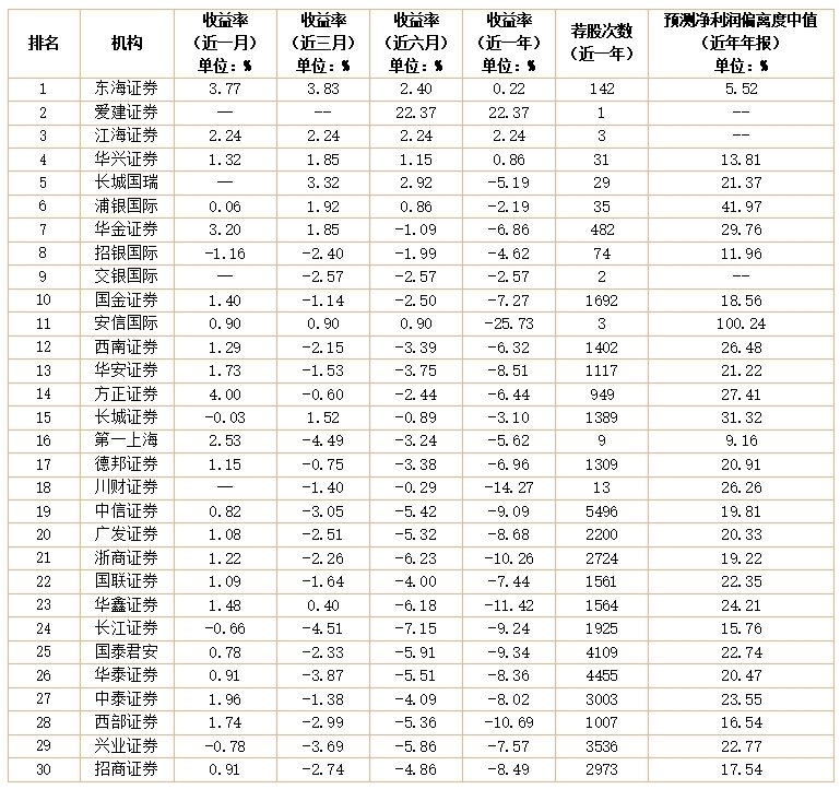 在这样的背景下,券商研究实力谁能脱颖而出呢?投资快报投研通券商研究实力榜数据显示,10月券商研究实力榜前3名分别是东海证券、爱建证券、江海证券,排第4名至第10名则依次是华兴证券、长城国瑞、浦银国际、华金证券、招银国际、交银国际、国金证券。
