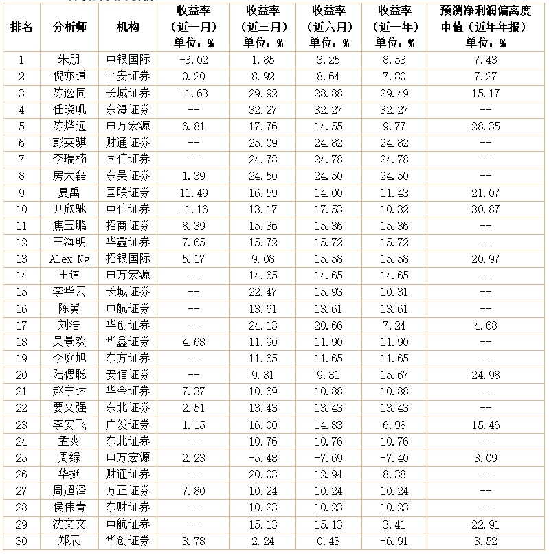数据显示,朱朋近一个月、近三个月、近六个月和近一年收益率分别为-3.021%、1.85%、3.25%和8.53%;近年年报预测净利润偏离度中值为7.43%。朱朋今年以来“推荐”的个股包括保隆科技(603197)、银轮股份(002126)等年内累计涨幅超过30%的个股。