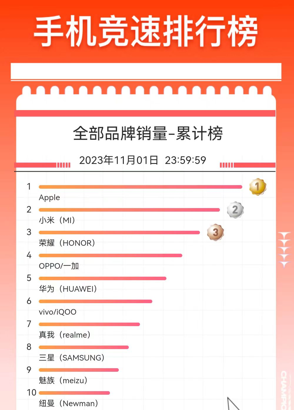 先来看看京东11.11手机竞速排行榜中的全部品牌销量累计榜,从10月23日晚8点到11月1日24点期间,iPhone、小米、荣耀的手机销量排行前三,OPPO/一加、华为、vivo/iQOO、realme真我、三星、魅族、纽曼也收获消费者喜爱,进入榜单前十。