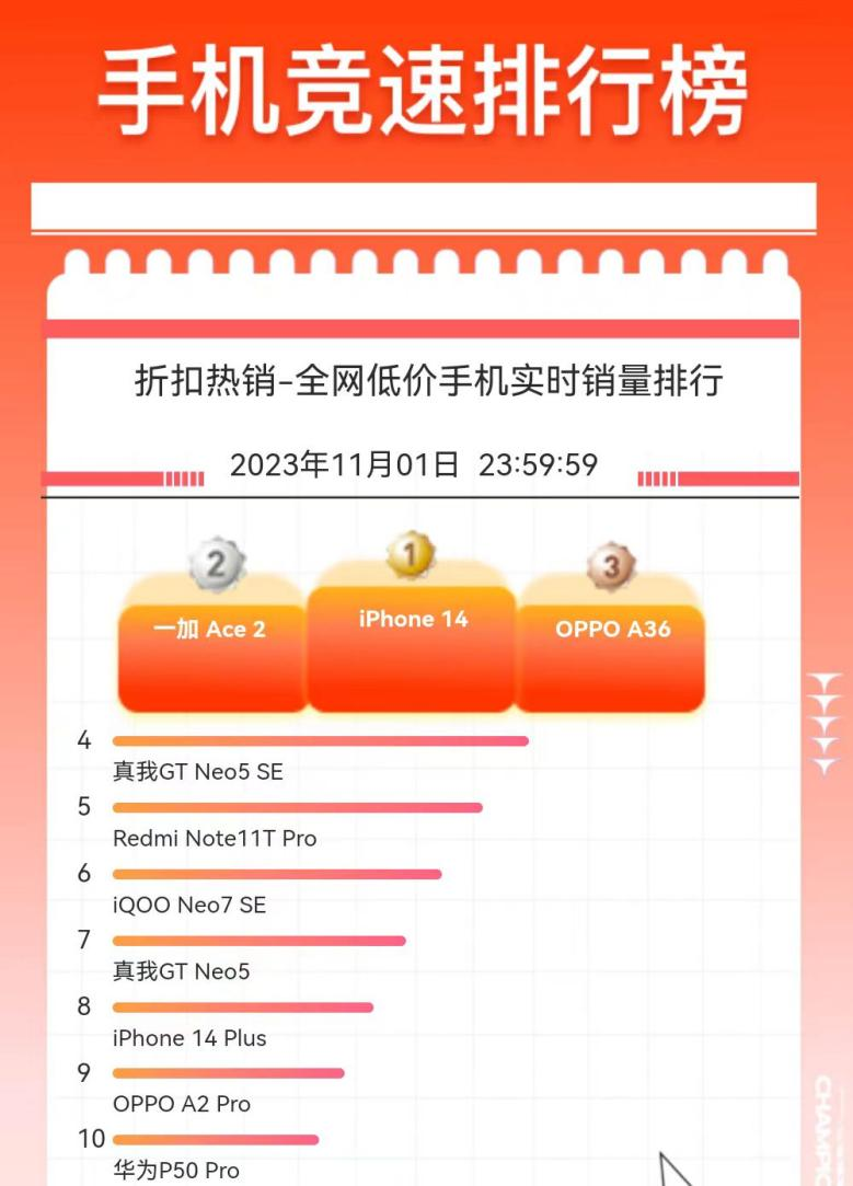 想要在京东11.11购买折扣力度大的手机产品可以参考手机竞速排行榜中的折扣热销-全网低价手机实时销量排行榜。以11月1日24时为例,iPhone 14、一加 Ace 2、OPPO A36成为折扣热销竞速榜前三,都是折扣力度够高且有超多消费者选择的款式。想要购买折扣力度大的手机,那就可以关注折扣热销竞速榜,了解实时低价折扣产品信息。