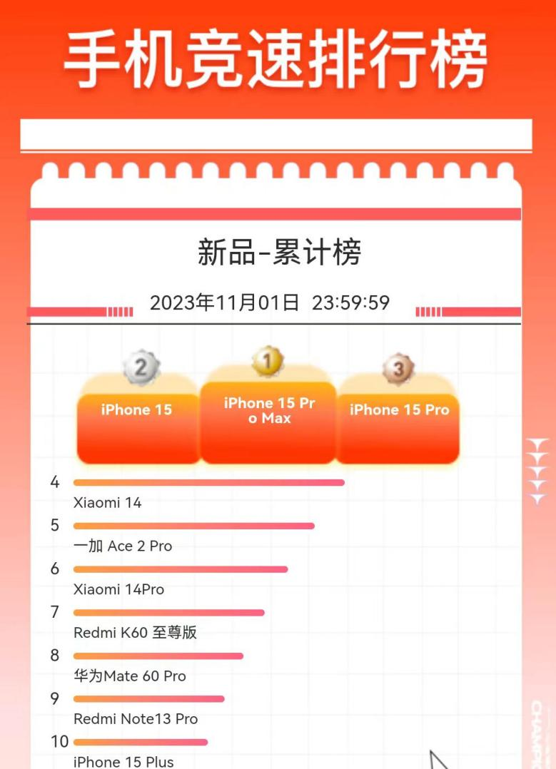 再来看京东11.11手机竞速排行榜中的全部单品累计榜。以从23日晚8点到11月1日24点的手机单品累计竞速榜为例,iPhone 15系列凭借强悍性能和实在的优惠力度包揽全部单品手机累计竞速榜前三。第4名则是Redmi Note 12 Pro,索尼IMX766传感器与OIS光学防抖赋予手机不错影像性能,天玑1080芯片、OLED柔性直屏、5000mAh电池和轻薄体验,加上超高性价比,Redmi Note 12 Pro足够有吸引力。值得注意的是,10月31日晚8点才正式开售的小米14也进入了全部手机单品累计榜第六的位置,第三代骁龙8移动平台、小米澎湃OS、新一代Summilux镜头、光影猎人900的配置足够令消费者心动。