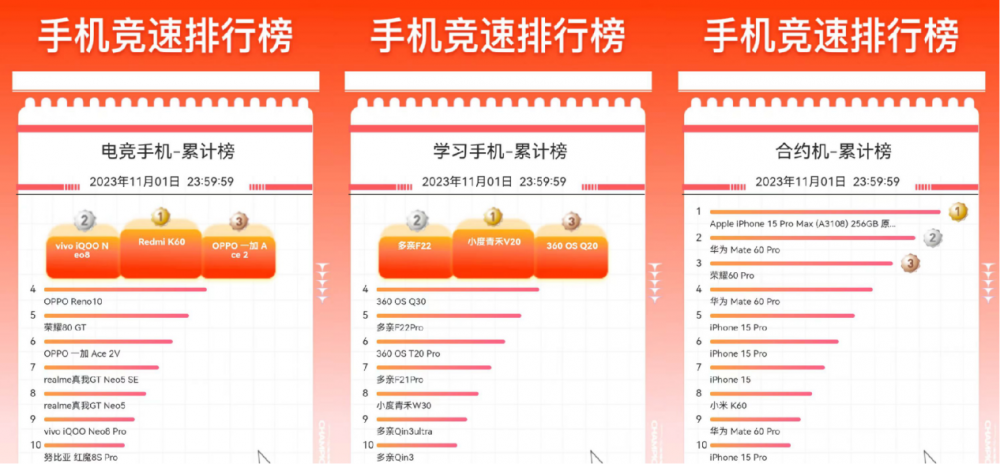 此外,京东11.11手机竞速排行榜还有电竞手机、学习手机、合约机的榜单可以选择,喜欢游戏手机、给孩子买手机的消费者都可以找到合适的产品,能够提供专属低价和更多选择空间的合约机也是不错的选择。