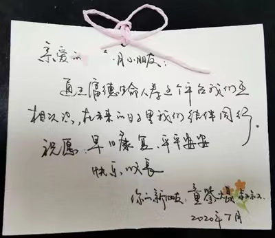当时,小月还在医院住院治疗,她拿起问候卡一字一句地认真读完,花一样的笑容始终绽放在稚嫩的脸上。小月开心地和前来看望她的工作人员说:“很高兴结交到这位新朋友,童叔叔送的礼物我非常喜欢,我一定乐观坚强,勇敢向前。”工作人员也鼓励小月要有信心,积极配合治疗,争取早日康复。工作人员还贴心地将本次的看望照片发给了童鉴焜。