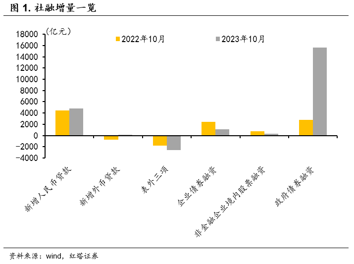 2023年10月末社会融资规模存量为374.17万亿元,同比增长9.3%,上月增速为9.0%。10月份社会融资规模增量为1.85万亿元,比上年同期多9108亿元,也高于市场预期(1.81万亿元)。其中,政府债券融资同比明显多增,实体信贷同比小幅多增,企业债券融资额同比回落。