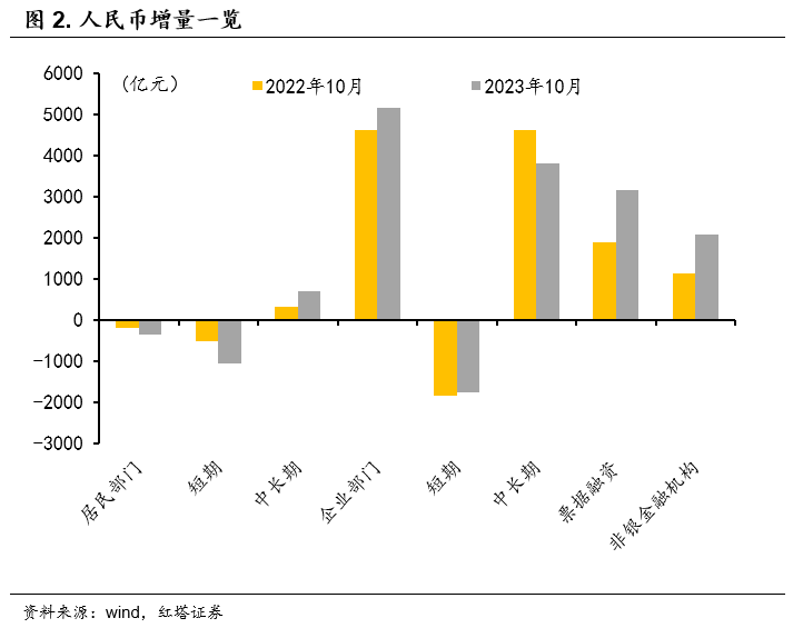 信贷口径下,10月份人民币贷款增加7384亿元,同比多增1058亿元。其中,票据融资增加3176亿元,同比多增1271亿元,是信贷同比多增的主要支撑项目。实体经济部门加杠杆意愿不足,银行为完成业绩目标就将表外票据转至表内,以票据冲抵贷款规模。
