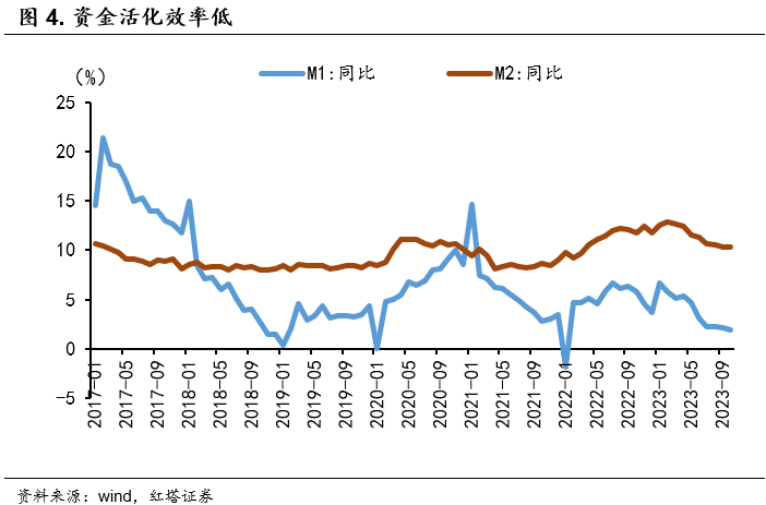 第四,M1大幅走低,“M2-M1”剪刀差扩大。