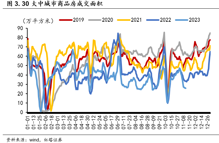 从30大中城市数据来看,地产景气度还在低位,居民购房意愿未得到持续改善。10月商品房成交面积月均值的同比增速回升了近20个百分点,但楼市回暖不均匀,一线、二线、三线城市商品房成交面积月均值分别同比-7.7%、+9.8%和-23.2%。持续性也不够,11月份成交热度再次回落, 1日至12日合计口径下的日均成交面积同比下滑25.1%[1]。